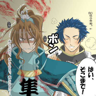 朝一でランキングの確認をして、今日の予定の原稿のペン入れをキャンセルして落書きに没頭していましたw 今、このタイミングを逃したら2度と描けない気がする…w(万死) 落書きの元ネタは藍家の愚兄その4と方向音痴の紅家の跡取り。 自分的に違和感無しw 色塗ったら相変わらずロックオンな姜維…(苦笑