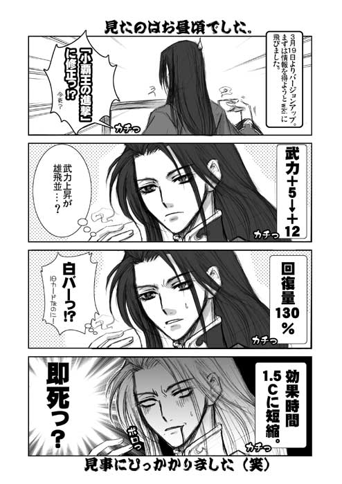 そう言えば、荀彧さんの反計が上方らしいので確認しに行こうかねぇ…2月17日以降、魏デッキ使ってないし(W 隠密の春華ちゃんも…隠密ってあんなに長くなってたんですね。 苦楽に入ってるわけだ。 魏武デッキで遊んでみるか~☆ 練習カード作ったら、安心して色んなデッキで遊べるからイイですね! 何でもっと早く作らなかったんだか…? うむ~、結構ネタが出てくる。 本のPは増やせないのにな(汗