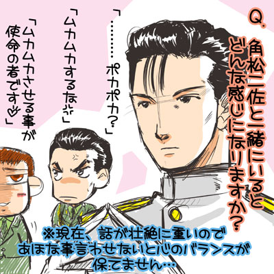 アニメは如月が出る前で終了だかんね(W これからだろうって感じなんだが(W 草加と角松の追いかけっこは、ルパンととっつあんのアレのようだ。 付き合わされる如月が不憫でならない…(W 年下に世話される程の二佐の無謀っぷりが何かもう言葉に出来ない、素敵な事ね☆ 先生…地雷と不発弾ばら撒きすぎですぜ(吐血 俺、生き延びる事が出来るのか!?