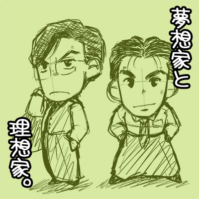 曹操描いてくれる人いないんで、深町と速水描いて補完しようかと落描きしてたけど、他のにまで飛び火してどーすんだよ、俺(W 海江田と山中も描いてあげたいなぁ。 海江田の色んな顔を見れるの山中だけだもんな。 凄い信頼だよ、あれ。
